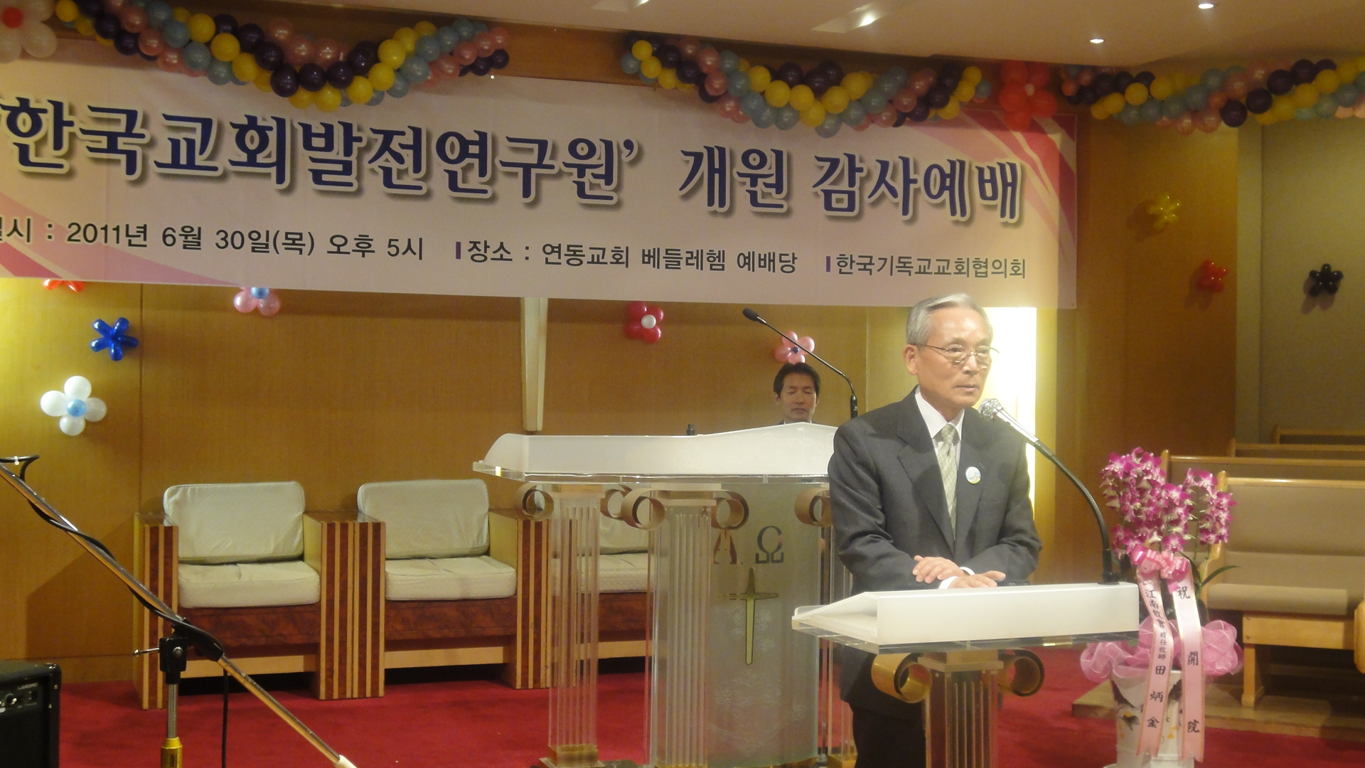 2부 축하 순서에서 이사장이신 이영훈 목사(교회협 회장, 여의도순복음교회)는 "한국교회 130년 가까이 되는 선교 역사 속에서 가장 큰 숙제가 바로 분열된 교회가 하나 되는 것"이라면서 "한국교회발전연구원이 교회가 나갈 방향을 연구해서 한국교회 전체를 네트워킹할 수 있었으면 좋겠다"고 말했습니다. 또한 원장으로 선임되 이성희 목사(교회협 신앙과직제위원장, 연동교회)는 "한국교회가 앞으로 발전시켜야 할 과제를 비롯해 지역교회들이 공감하는 문제와 교회 본질 회복을 위한 과제 등을 잘 연구해 한국교회가 발전해 나갈 수 있도록 노력하겠다"고 의지를 밝혔습니다