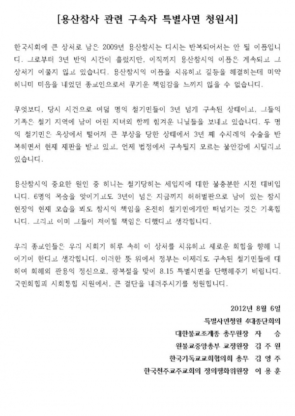 [청원서] 4대 종단 용산참사 관련 구속자 특별사면 청원