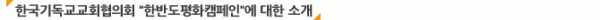 2. 한반도평화캠페인 “한반도 분단, 더 이상 용납해서는 안된다”는 기치 아래, 평화체제구축을 위한 서명 운동을 벌인다. 남북분단 및 평화구축의 문제는 남과 북만의 문제가 아닌, 분단에 참여했던 당사국들, 현재 동북아시아에서의 패권과 지정학적 이해관계에 있는 강대국이 함께 풀어야할 문제이다. 한국기독교교회협의회는 관련국의 교회와 연대를 통해 정전체제를 끝내고 평화로운 한반도를 만드는 캠페인을 벌인다. 또한 정전협정 체결 59주년인 2012년 7월 27일에 범종교인들이 함께 하는 한국종교인 평화선언을 발표한다. 평화선언에는 남북 당국과 정치권, 시민사회와 국제사회에 드리는 내용을 포함한다.