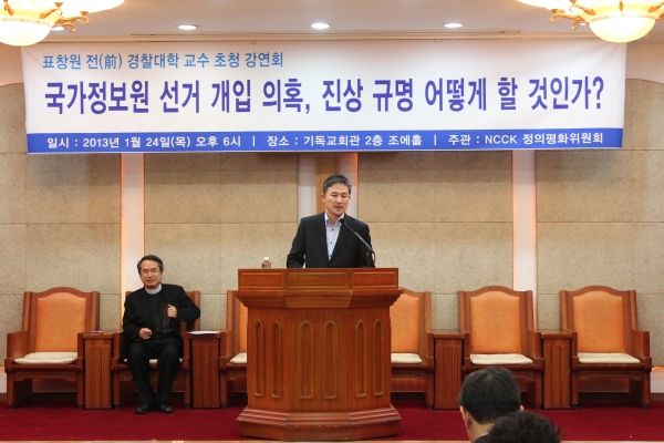 On Monday, Jan. 21, the NCCK Justice and Peace Committee held a press conference, with an announcement the chairperson, Rev. Huh Won Bae, of the establishment of a Truth Commission to hold up some of the unanswered questions about the election. One of the most disturbing questions is the sip-al-dan SNS manipulating. If a sip-al-dan located a comment which praised the candidate Park Geun Hye, it was transmitted lavishly; while at the same time, malicious and slanderous comments were spread about candidate Moon Jae In. Unfortunately, Christian bodies have been implicated in this, and Rev. Yoon Jung Hoon has been arrested for illegal action during an election campaign. Even more disturbing is evidence that the National Security Agency gave the sip-al-dan access to computers and the Saenuri Party, the party of candidate Park, gave funding to them.
