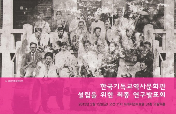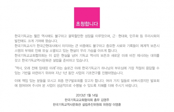 ❙ 일시: 2013년 2월 15일(금) 오전 11시❙ 장소: 프레지던트호텔 31층 모짤트홀❙ 주요내용* 진행: 김광준 신부(서기)∙ 인사: 김근상 주교(교회협 회장)∙ 해설: 이영훈 목사(위원장) - 한국교회의 미래를 준비하며∙ 연구발표 - 역사관의 필요성, 사업내용, 기대효과∙ 질의응답∙ 기념행사∙ 기념사진촬영∙ 공동식사