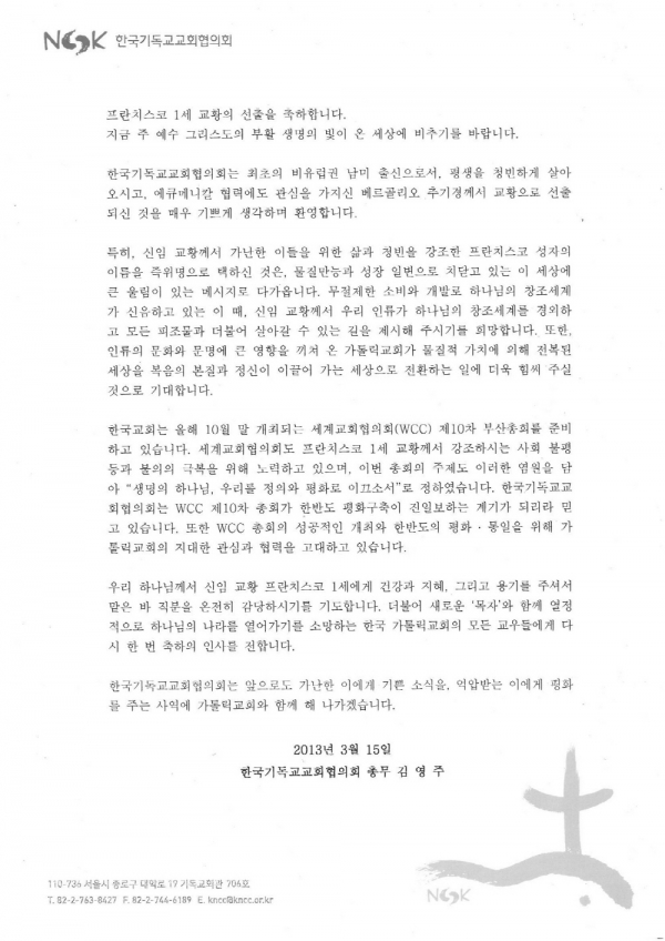 신임교황 선출에 대한 교회협의 축하인사