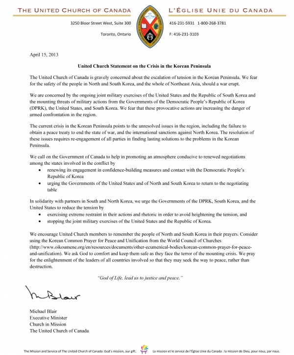 United Church Statement on the Crisis in the Korean Peninsula