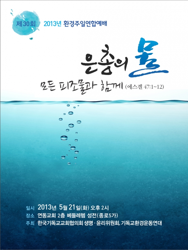 특별히 2013년 ‘세계 물협력의 해(United Nations International Year of Water Cooperation)’를 맞아 “은총의 물, 모든 피조물과 함께”로 주제를 정하고 물로 인해 고 통 받는 이웃들을 돌아보며 신앙인으로서 ‘더불어 살아가는 삶’을 다짐하는 계기로 삼고자 합니다.