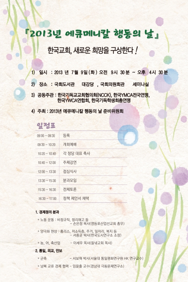 2013년은 새로운 정부가 시작되는 해이며, 앞으로 5년 한국사회를 이끌어가야 하는 중요한 시기입니다. 이에 한국교회가 정부의 예산과 정책을 분석하여 문제점을 찾아내고 대안을 모색하는 일은 매우 소중한 일입니다. 2013년에 이어 새 희망의 2014년을 구상하기 위해 『에큐메니칼 행동의 날』로 한 자리에 모입니다. 이 날은 하나님께서 주신 시대적 사명을 확인하고 각자 삶의 자리에서 열심히 활동했던 모든 그리스도인들이 한 자리에 모여 새로운 희망과 비전을 구상하는 날입니다.