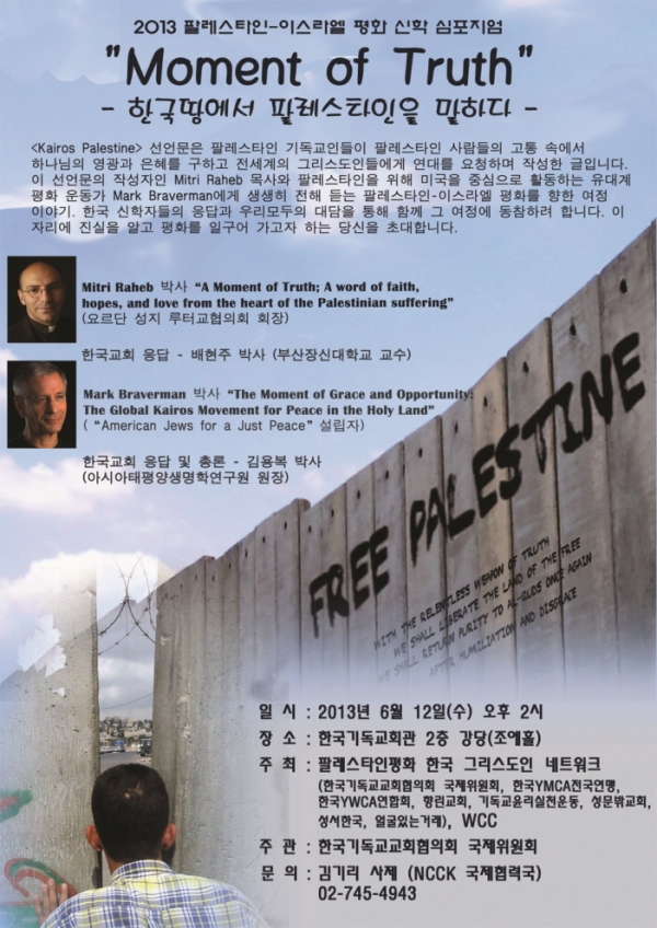 심포지엄은 선언문 작성자인 미트리 라헵 목사(Rev. Dr. Mitri Raheb)와 미국을 중심으로 팔레스타인 평화운동을 펼치는 유태계 미국인 평화운동가 마크 브레이버만 박사(Dr. Mark Braverman)의 발제와 배현주 교수(부산장신대), 김용복 박사(아시아태평양생명학연구원 원장)의 한국교회의 응답의 시간으로 진행됩니다. 심포지엄을 통해 WCC 부산총회를 앞두고 고난 가운데 동병상련의 아픔을 겪는 한국교회와 팔레스타인이 함께 하나님나라의 평화가 이 땅에 실현되는 길을 모색하고, 한국교회와 팔레스타인의 평화 연대를 통해 세계 교회의 한반도 평화에 대한 지지와 협력을 다지고자 합니다.
