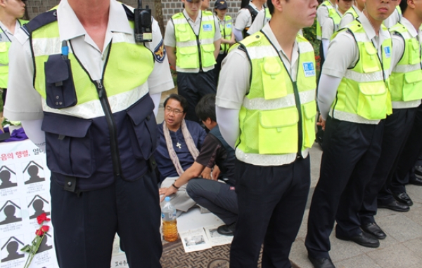 ![]() ▲ 최헌국 목사가 쌍용자동차 노동자들의 노숙시위를 원천봉쇄한 것에 항의하며 단식농성을 하고 있는 최헌국 목사 주위로 경찰이 에워싸고 있는 현장에서 기자회견이 열렸다. 경찰 사이로 최 목사가 앉아 있는 것이 보이고 있다.