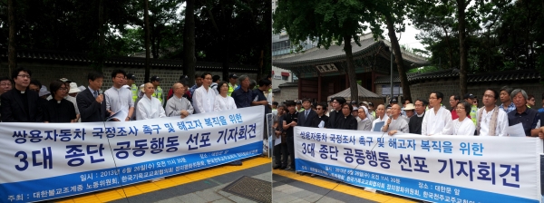 이런 마음을 기독교 뿐 아니라 3대 종단(기독교, 불교, 천주교)이 함께 담아 "쌍용자동차 국정조사 및 해고자 복직을 위한 공동 행동 선포 기자회견"을 개최하였고, 3대 종단이 한 마음으로 기도하고 한 행동으로 움직임으로써 쌍용자동차 사태가 조속히 해결될 수 있기를 기원하는 마음으로 다음과 같은 성명서를 발표하였습니다.