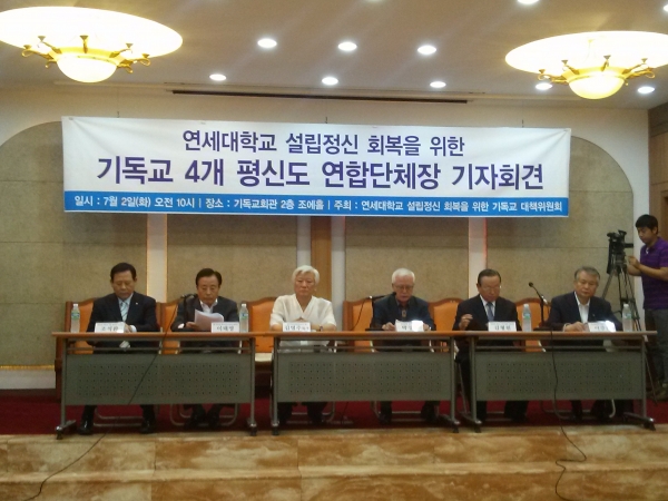 한국장로회총연합회와 한국교회평신도단체협의회, 한국교회평신도지도자협회, 기독교대한감리회장로회전국연합회 등 4개 평신도 단체들은 2일 오전 서울 연지동 한국기독교회관 조에홀에서 기자회견을 갖고 ‘연세대 설립정신 회복을 위한 평신도 대책위원회’(가칭·평신도 대책위)를 구성, 본격적인 활동을 시작하겠다고 밝혔다.