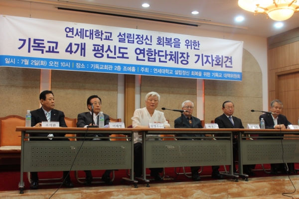 ![]() 한국기독교교회협의회 '연세대 설립정신 회복을 위한 기독교대책위원회'(위원장 손달익 목사)는 평신도 연합단체장들과의 협의를 통해 한국교회가 연세대 문제에 더욱 적극적이고 깊은 관심을 가져야 한다는 공감을 나누었습니다. 이에 대책위원회는 7월 2일 (화) 오전 10시 서울 연지동 한국기독교회관에서 ‘연세대 설립정신 회복을 위한 기독교 4개 평신도 연합단체장 기자회견’을 개최하였습니다. 이 자리에서는 박경진 장로(한국장로회총연합회 대표회장)이 인사말을 전하였고, 이태영 장로(전 한국교회 평신단체협의회 대표회장)이 기자회견의 취지를 설명하였습니다. 향후 활동계획은 이강전 장로(대한기독교감리회 장로회 전국연합회장)가 발표하였고, 선언서는 김형원 장로(한국교회 평신도지도자협회 대표회장)이 낭독하였습니다. 이 자리에서 교회협 김영주 총무는 “연세대 문제는 교단이 이사 파송 권한을 유지하느냐 마느냐 하는 지엽적인 문제가 아니다”라며 “우리는 기필코 정관을 원상회복할 것이며, 이 일에 평신도 지도자들이 참여의지를 보여주셔서 진심으로 감사드린다”는 인사의 말을 전하였습니다. 이날 발표된 선언서와 향후 활동계획은 아래와 같습니다.