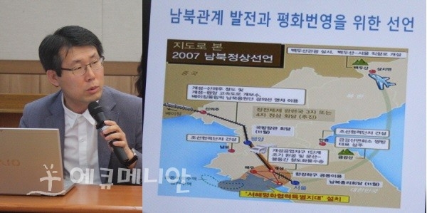 ![]() ▲ 서보혁 연구위원(서울대 통일평화연구원)이 2007년 남북정상회담에서 합의한 서해특별지대에 대해 지도를 보여주며 설명하고 있다. ⓒ에큐메니안
