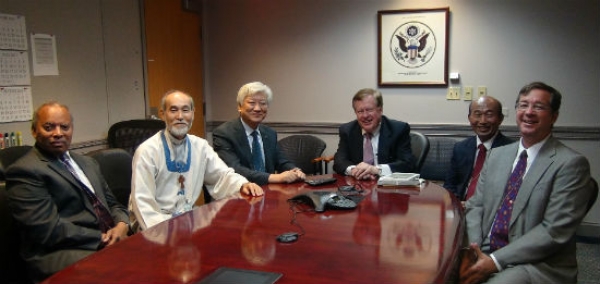 ![]() ▲ 미국 국무부 북한인권 대사 사무실을 방문한 교회협 대표단. 왼쪽부터 짐 링클러 UMC 사회선교국장, 조헌정 교회협 화해통일위원장, 김영주 교회협 총무, 로버트 킹 미 국무부 북한인권 대사, 노정선 교수, 마크 해리슨 목사.ⓒ뉴스미션