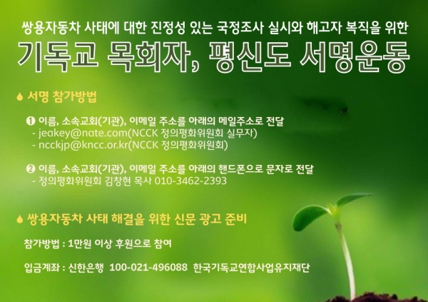 이런 안타까운 상황을 바라보며 우리가, 내가 할 수 있는 것이 없기에 마음만 애타고 있습니다. 우리의 마음을 모아 쌍용자동차 사태 해결을 위한 서명운동을 아래와 같이 진행합니다. 또한 쌍용자동차 사태의 진실을 보다 널리 알리기 위해 신문광고 후원 운동도 함께 진행합니다. 적극적으로 참여해주시고, 널리 알려주세요.