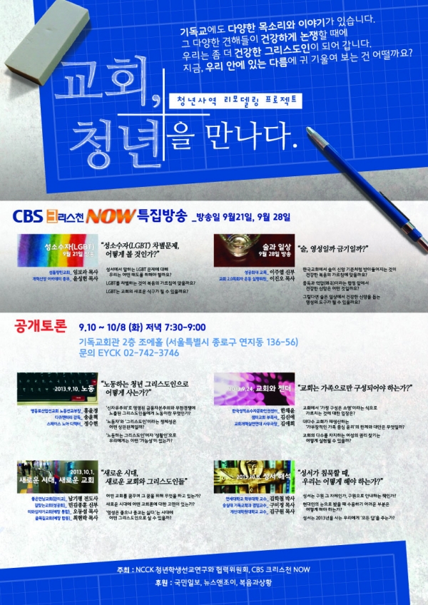 지난 8월 31일에는 CBS 크리스천 NOW와 공동으로 '교회, 청년을 만나다' 특집 방송을 제작했다. '성소수자(LGBT)'와 '술과 일상' 두 개의 주제를 다루었다. 방송은 9월 21일(토), 28일(토)에 한다.