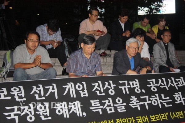 ![]() ▲ 국정원의 선거 개입 사건 진상을 밝히기 위한 릴레이 화요기도회가 3일 저녁 7시 청계광장 파이낸스 빌딩 앞에서 열렸다. ⓒ에큐메니안