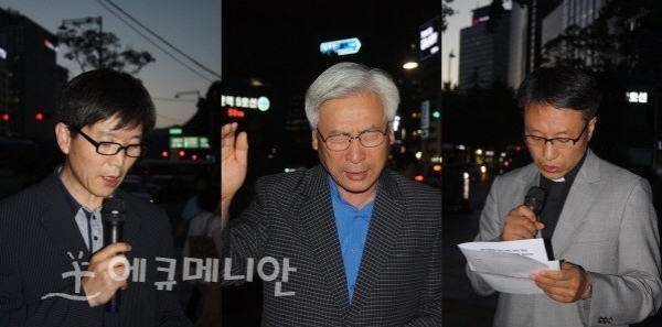 ![]() ▲ 왼쪽부터 시계방향으로 기도회 사회를 맡은 박승렬 목사(기독교공대위 위원), 기도 김한승 신부(NCCK 정의평화위원회 위원), 축도 장변선 목사(산유리교회). ⓒ에큐메니안