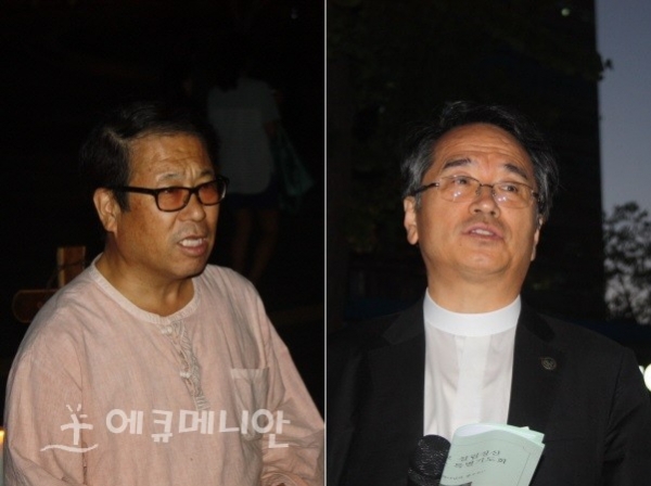![]() ▲ 증언마당에서 이야기를 전하는 이적 목사(인천 목정평 부회장, 왼쪽)와 기도회 설교를 전한 김성복 목사 (기독교공대위 위원장, 오른쪽). ⓒ에큐메니안