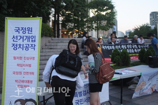 ![]() ▲ 기도회가 열리는 같은 장소에서 '국정원 선거개입 정치공작 특검수사 촉구' 서명운동이 진행되고 있다. ⓒ에큐메니안 |