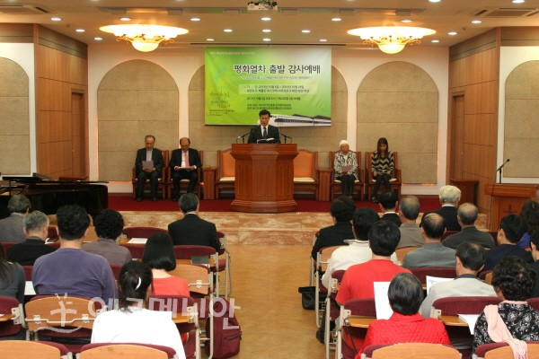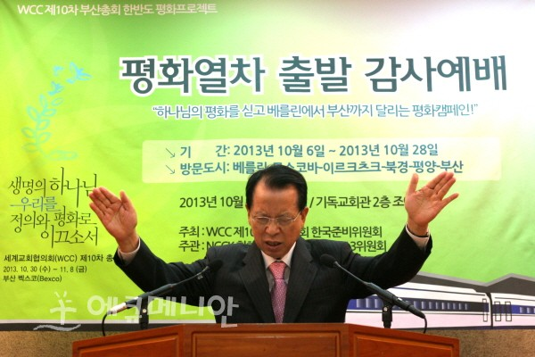 베를린에서 출발해 모스크바와 베이징을 통과하는 ‘2013 한반도 화해와 통일을 위한 평화열차’의 출발 이틀을 앞두고 이를 알리는 감사예배가 4일 오후5시 한국기독교회관 조에홀에서 열렸다. 평화열차 참가자들과 목회자 및 교인들은 한반도의 분단의 아픔을 세계에 알리고 세계 기독인들과 함께 평화를 염원하는 행사가 되길 희망했다. 77세로 가장 고령의 참가자인 한국여교역자연합회 전 회장 정숙자 목사는 “한반도 분단의 아픔은 우리만의 문제가 아니”라며 “(이번 평화열차를 통해) 진정한 평화의 씨앗이 뿌려지길 바란다.”고 기도했다.