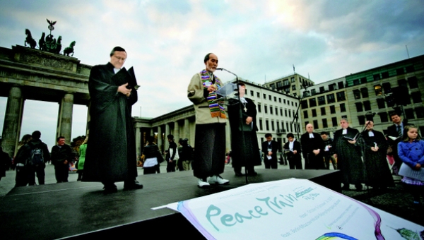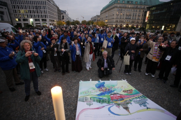 ‘세계교회협의회(WCC) 10차 총회 한국준비위원회’는 7일(현지시각) 오후 6시 베를린 브란덴부르크문 광장에서 15개국에서 온 120여명의 평화열차 참가자들과 ‘한반도 평화를 위한 예배’를 열었다. 한국인들과 촛불예배를 함께 준비한 울리케 트라우트바인 목사는 설교에서 “평화열차는 전세계의 평화와 화해에 대한 성경적 비전을 상징하고 있다. 이 열차는 우리로 하여금 세계대전의 수많은 희생자들을 기억하게 할 것”이라고 말했다. 그는 “아직도 모든 칼을 쟁기로 만들지 못했다. 평화열차가 커다란 관심을 받게 되고 사람들을 평화의 길로 데리고 가게 되기를 빈다”고 덧붙였다. 한국과 독일 목회자들이 번갈아 발언을 하고 성경 구절을 인용하며 공동으로 예배를 이끌었다.