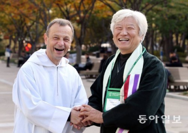 지난달 31일 WCC 총회가 진행 중인 부산 벡스코 광장에서 만난 프랑스 테제공동체 원장인 알로이스 수사(왼쪽)와 한국기독교교회협의회(NCCK) 김영주 총무. 신한열 수사의 통역으로 진행된 대담에서 이들은 “소박한 삶 속에 사랑과 겸손으로 사람들을 위로한 예수의 삶으로 돌아가야 한다”고 말했다. ![]() 1940년대 설립된 프랑스 테제공동체는 한 해 5만 명 이상의 젊은이들이 찾는 초교파 수행공동체. 단순 방문자까지 합하면 수십만 명의 발길이 이어진다. 개신교계 최대 행사인 세계교회협의회(WCC) 총회가 한창인 지난달 31일 대회장인 부산 벡스코에서 테제공동체 원장인 알로이스 수사(59)와 김영주(61) 한국기독교교회협의회(NCCK) 총무를 만났다. 1974년 테제에 입회한 알로이스 수사는 2005년 2대 원장으로 취임했으며, 교리를 넘어선 침묵의 영성과 다양성 속의 일치를 추구해왔다. 2010년부터 NCCK 총무로 활동해온 김 목사는 남북 화해와 교류를 위한 활동을 해왔다. 》