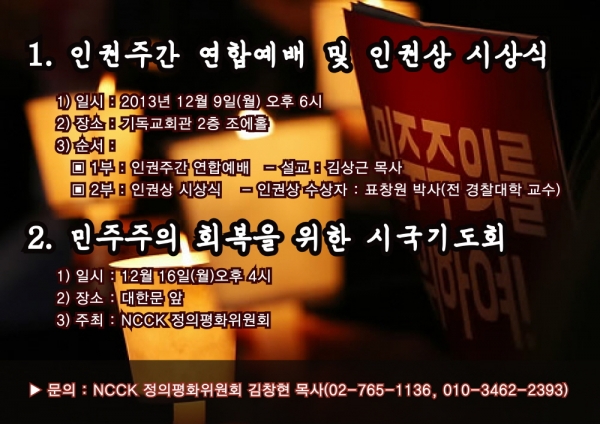 한 해를 돌아보면, 2013년은 한국사회를 갈등과 혼란에 빠뜨렸던 국가 권력기관의 선거 개입 사건을 비롯한 여러 시국 사건들로 매우 혼란스러운 한 해였습니다. 불법과 부정이 있는 곳에 하나님의 정의를 선포하고 정의를 이루어가는 것이 그리스도인의 사명이자 책임이기에, 이번 인권주일연합예배에서는 미결된 시국 사안들이 해결될 수 있기를 함께 기도하고자 하오니 많은 참석을 바랍니다.
