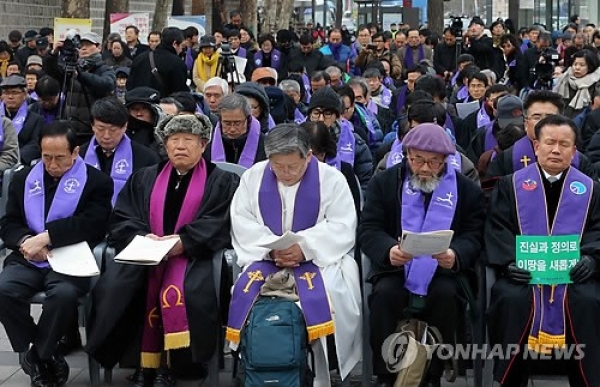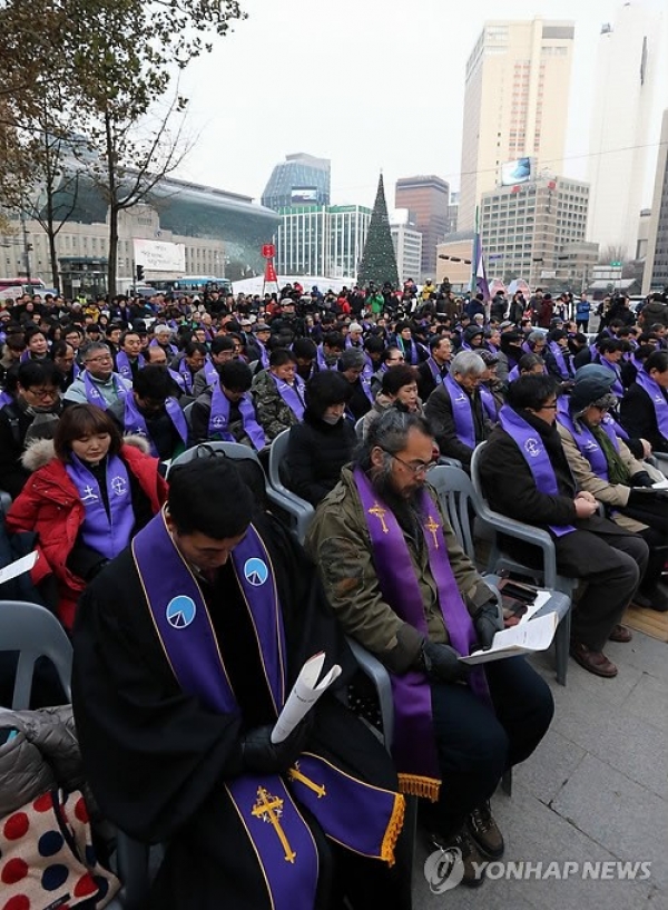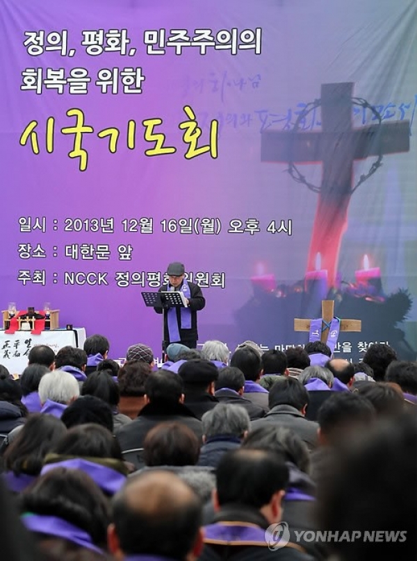 ![]() ▲시국기도회 개최한 한국기독교교회협의회 (서울=연합뉴스) 최재구 기자 = 16일 서울 대한문 앞에서 한국기독교교회협의회 정의ㆍ평화 위원회 주관으로 열린 '정의ㆍ평화 민주주의의 회복을 위한 시국기도회'에서 참석자들이 기도하고 있다. 2013.12.16 jjaeck9@yna.co.kr