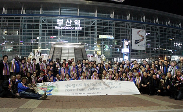 ![]() The train, finally, was unable to go to Pyongyang; the passengers cried out their longing and asserted their vision for the future from Dandong, China, across the Yalu River, the border between China and North Korea. They changed to a ferry which took them across the West Sea to Incheon/Seoul, and then made the final leg of the trip by train to Busan, where they were warmly welcomed by enthusiastic greeters at Busan Station, to proclaim the good news of peace to WCC.