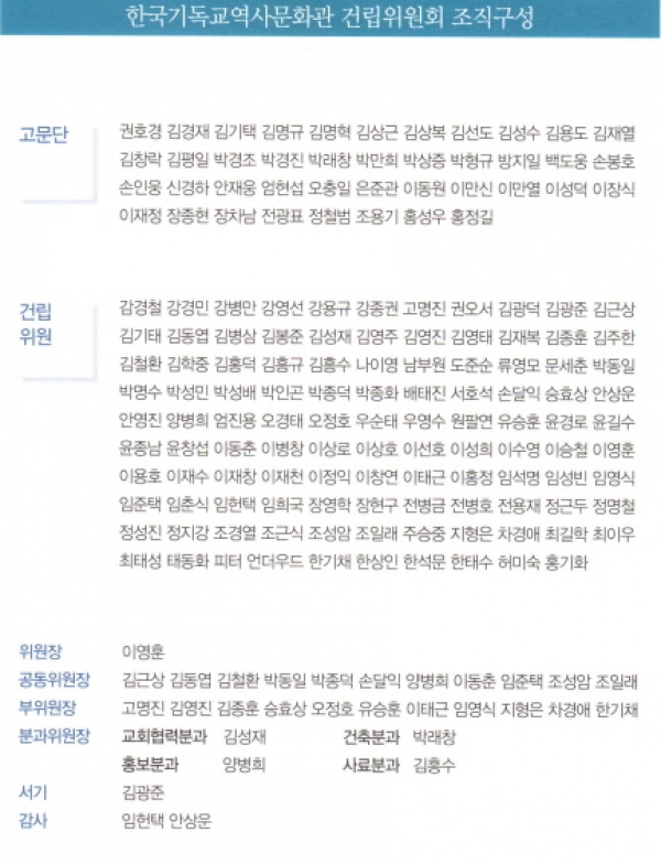 건립위원회는 현재 발표된 구성원 이외에도 계속해서 조직을 확대한다는 방침이다. 열린 조직을 표방하며 한국교회 일치의 상징으로 역사문화관을 건립한다는 취지를 살리기 위해서다. |