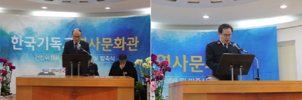역사문화관의 시작이 하나님의 새로운 축복이라 생각한다.”라고 격려하였습니다. 이어 이만열 장로(숙명여대 명예교수)는 “교파를 초월한 기독교 역사문화유산을 수집하고 보존하려는 데 대해 기쁘게 생각하며 좋은 결실이 이루어지길 바란다.”라고 말하며 더불어 “정부의 지원이 자극제가 되어 한국교회가 더욱 노력해야 하고, 무릎 꿇고 기도하며 서로의 짐을 나누어야 한다.”라고 당부하였습니다.