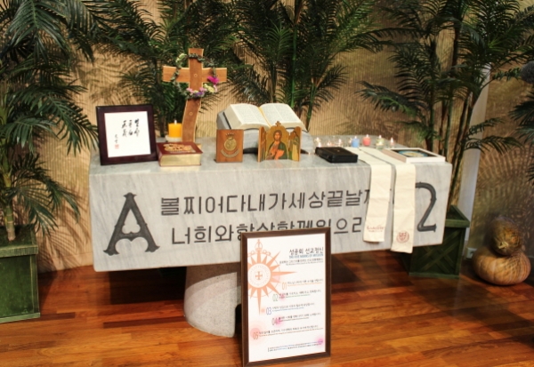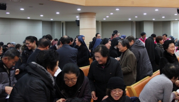 This annual service took place on Wednesday, Jan. 22, at Mokmin Presbyterian Church. Using the service written by the Canadian Council of Churches, we reflected on the passage from I Corinthians 1:13, “Is Christ divided?” Just having experienced the World Council of Churches General Assembly, and having seen the diversity of Christian experiences gathered together as one in Busan, it was a very pertinent question. Catholic Archbishop Kim Hee Jun preached, and the high point of the service was when the representative leaders of each denomination presented the special gift of their denomination to the gathering… from the Orthodox, an icon to represent deep spirituality and the life of prayer; from the NCCK, a cross wreathed in flowers, to remind of both suffering and new life that comes from following Jesus; from the Methodists, a stole to represent the service to which Christ calls; and so on.