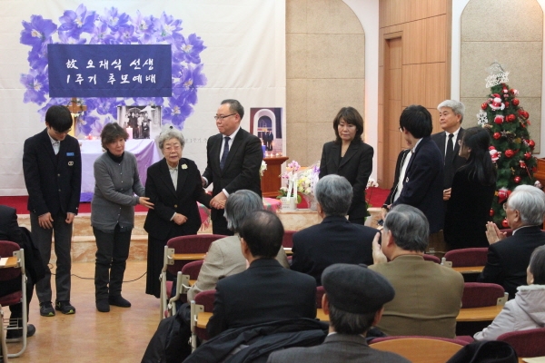 On Jan. 3, the one-year memorial worship was held for our beloved Dr. Oh Jae Shik, one of the great ecumenical leaders of Korea, who passed away last Jan. The NCCK arranged for a bus to transport guests to the cemetery at MaSeok, where many human rights and democracy leaders are buried, for the remembering of Dr. Oh. Words of welcome were offered by Rev. Ahn Jae Woong, with YMCA Korea and formerly of CCA. The unveiling of his gravestone was done by Mrs. Noh Ik Shin, Oh’s wife and his friend Rev. Park Hyung Kyu; the inscription on the gravestone was read by Rev. Kim Young Ju. A memorial address was given by Prof. Park Kyung Seo, and then the assembly laid flowers at the grave.