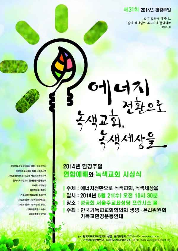 하나님의 창조세계와 섭리를 묵상하고, 그 질서의 보전을 위해 예배드리는 환경주일이 올해로 서른 한 번째를 맞이합니다. 한국공해문제연구소(기독교환경운동연대의 전신)는 1984년부터 6월 첫째 주일을 환경주일로 정하였고, 한국기독교교회협의회(NCCK)는 1992년부터 회원 교단과 함께 환경주일을 지키며, 공동 설교문과 기도문 등을 전국 교회에 배포해 왔습니다. 우리는 지금 과도한 에너지 소비로 인해, 에너지 고갈은 물론 화력발전과 원자력발전이 가져다 준 기후붕괴와 방사능에 의한 지구멸절의 위기 앞에 놓여 있습니다. 이는 다음 세대에게 커다란 빚을 떠넘기는 참으로 ‘미안한’ 상황입니다. 이러한 문제의식 속에서 올해는 환경주일의 주제를 ‘에너지 전환으로 녹색교회, 녹색세상을’로 정하였습니다. 지구온난화를 가중시키고 위험천만한 화력·원자력 발전으로 에너지를 얻던 행태를 벗어나 하나님이 주신 자연의 에너지로 전환하고, 생활 속에서 에너지를 절약하는 실천을 통해 녹색교회와 녹색세상을 만들어 갈 것을 제안합니다. 상단에 첨부한 ‘2014년 환경주일 자료집’과 포스터를 적극 활용해 주시기를 바랍니다. 올해도 아래와 같이 ‘환경주일 연합예배와 녹색교회 시상식’을 개최합니다. 환경 위기 속에서도 하나님이 창조하신 세계를 보전하는 선교적 사명을 잘 감당한 교회들이 녹색교회로 선정되는 자리에 함께 하셔서 축하해 주시고 격려해 주시기를 바랍니다. 또한, 함께 예배드림으로 모두가 녹색교회로 거듭날 것을 하나님 앞에 다짐하는 귀한 시간이 되기를 바랍니다. ▶ 아 래 ◀ 2014년 환경주일 연합예배와 녹색교회 시상식 * 일시 : 2014년 5월 21일(수) 오전 10시 30분 * 장소 : 성공회 서울주교좌성당 프란시스홀 * 주제 : 에너지전환으로 녹색교회, 녹색세상을 * 주최 : 한국기독교교회협의회 생명·윤리위원회, 기독교환경운동연대 * 순서 :Ⅰ부 2013 환경주일연합예배 (설교: NCCK 생명윤리위원회 위원장 이상진 목사 인사말: NCCK 총무 김영주 목사), Ⅱ부 녹색교회 시상식 * 수상교회 : 총 5개 교회 - 푸른마을교회(예장 통합, 담임 이상은 목사, 포항시 북구 소재) - 사랑방교회(예장 통합, 담임 정태일 목사, 경기도 포천시 소재) - 갈산교회(감리교, 담임 안인철 목사, 충남 서산시 소재) - 구름산교회(기장, 담임 권의구 목사, 경기도 광명시 소재) - 성공회 원주교회(성공회, 담임 국충국 신부, 강원도 원지 소재) * 상단첨부: 2014 환경주일 자료집, 2014 환경주일 포스터