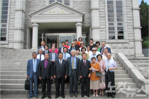 815 한반도 평화통일 남북공동기도회에 참석한 관계자들이 평양 봉수교회 앞에서 기념촬영을 하고 있다. 앞줄 왼쪽에서 세번째가 조선그리스도교연맹 강명철 위원장, 앞줄 왼쪽에서 네번째가 한국기독교교회협의회 김영주 총무남과 북의 교회가 함께 공동기도문을 낭독하는 목소리가 광복절인 지난 15일 오전, 평양 봉수교회에 울려퍼졌다.