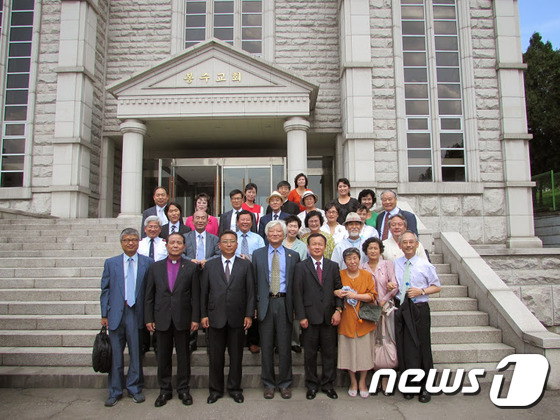 한국기독교교회협의회(NCCK.총무 김영주 목사)와 조선그리스도교련맹이 세계교회가 합의한 한반도 평화와 통일을 위한 8.15 공동기도주일의 의미를 되새기며 남북공동기도회를 평양 봉수교회에서 열고 있다.(NCCK제공) 2014.08.15/뉴스1 2014.09.15/뉴스1 © News1 염지은 기자