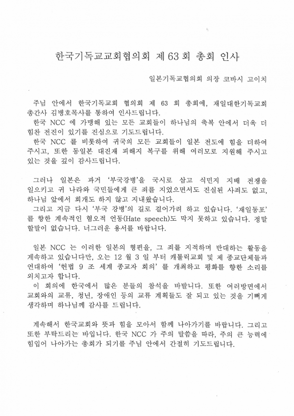 (보도) 일본기독교협의회의 63회 총회 축하메시지