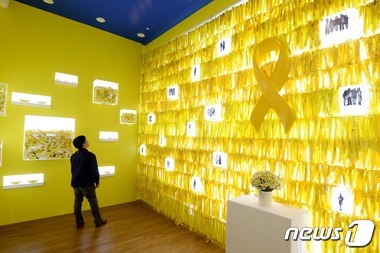 | 서울도서관에 마련된 '4·16 세월호 참사 기억공간'이 추모글이 적힌 노란리본으로 가득하다. © News1 정회성 기자 |