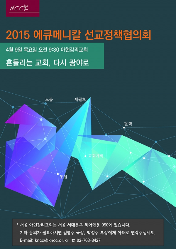 한국기독교교회협의회(NCCK, 총무 김영주 목사)는 4월 9일(목) 오전 9:30 아현교회(기독교대한감리회, 서울 서대문구 북아현동 950)에서 ‘2015 에큐메니칼정책협의회’를 개최한다.