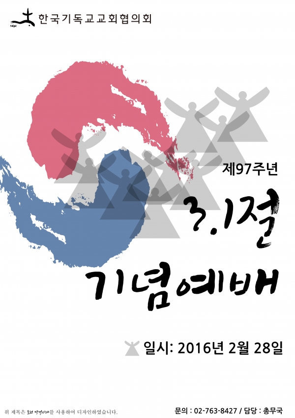 한국기독교교회협의회는 신앙 선조들의 숭고한 본을 따라 3.1 정신을 계승, 발전시키기 위하여 각 교회에서 3.1절 기념주일을 성수해 주시기를 요청합니다. 2월 28일(주일)에 포스터와 예배 및 설교자료를 참고하셔서 3.1절 기념주일 예배를 드려주시기를 바랍니다. |