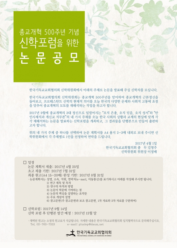 종교개혁 500주년 기념 신학포럼을 위한 논문공모