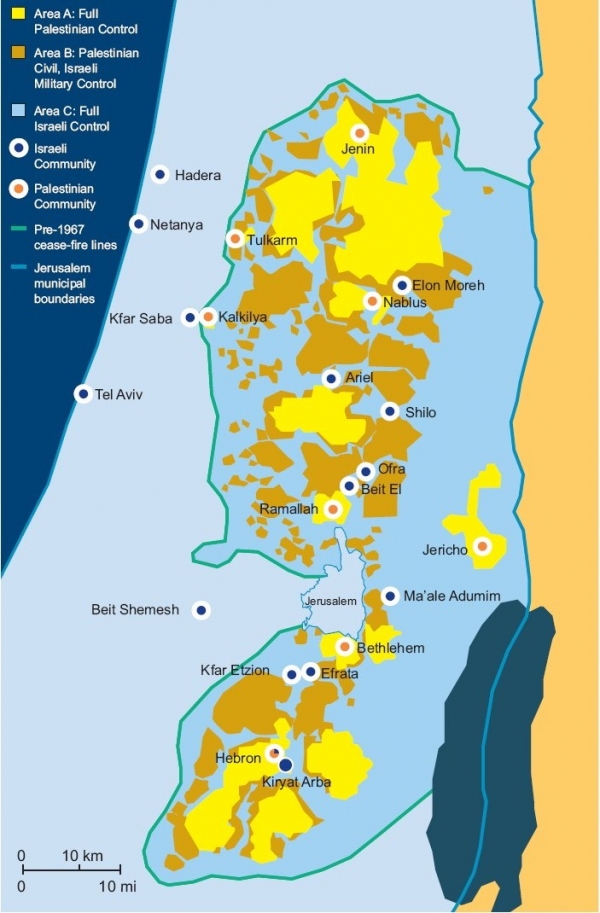 한편 서안 지구는 가자 지구와 함께 ‘팔레스타인 자치구’이지만, 실제로 자치가 가능한 범위는 약 40%에 불과하다. 팔레스타인 서안 지구는 오슬로 합의 이후 A·B·C의 3개 구역으로 나뉘어 져 있다. 팔레스타인 자치 정부는 A구역에는 교육, 보건 위생, 사회 복지 등 행정권과 경찰 등의 치안에 관한 권한을 팔레스타인에게 줬고, B구역에는 상기의 행정권만 주고, 치안에 관해서는 이스라엘이 관할한다. 그리고 서안 지구 전체의 60%이상을 차지하는 C구역에서는 이스라엘이 모든 권한을 갖는다. 즉, ‘팔레스타인 자치구’라는 서안 지구의 60% 이상이 실제로는 이스라엘 점령하에 있다는 것이다. 팔레스타인 자치 정부는 서안 지구의 절반 이하의 지역에서만 한정적인 자치권을 가지고 있으며, 외교, 안보, 군에 관한 권한은 없다.