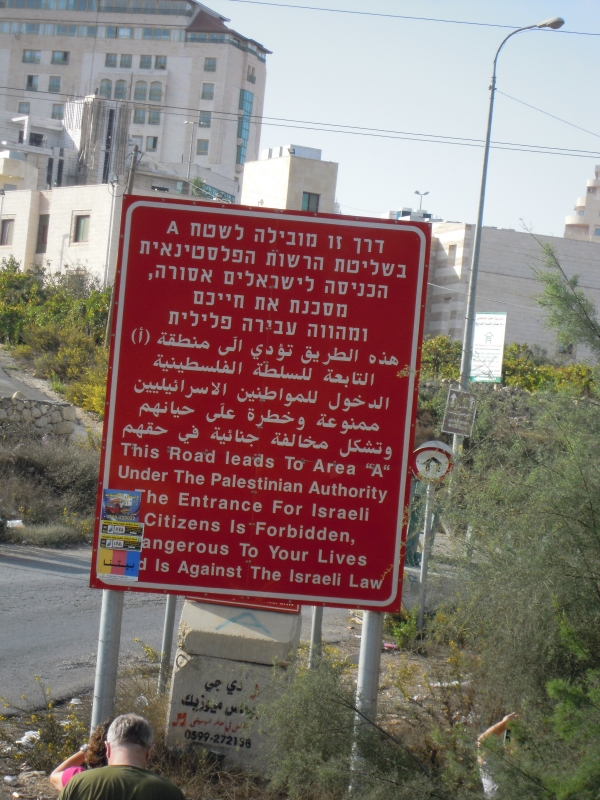 이는 "이곳부터A구역이며, 팔레스타인 당국이 감시한다. 이스라엘 시민이 넘어가는 것은 이스라엘 법으로 금지되며 넘어갈 경우 생명의 위험이 따른다" 는 내용이 적혀 있다. 팔레스타인 사람들을 테러리스트라고 규정짓는 것이 명백하다.