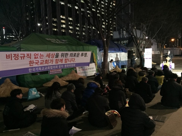 교회협 정의평화위원회는 비정규직 노동자와 함께하는 사순절 금식기도회 4일째인 지난 2월 23일(목) 저녁 7시, 광화문 세종로공원 비정규직 농성장에서 교회협 인권센터, 예장총회 국내선교부, 감리교 정의평화위원회, 기장 교회와사회위원회와 공동으로 “비정규직 없는 세상을 위한 사순절 금식기도회”를 드렸습니다. 또한 이 자리에서 비정규직없는 세상을 위한 우리의 입장을 발표했습니다. 전문은 아래와 같습니다.