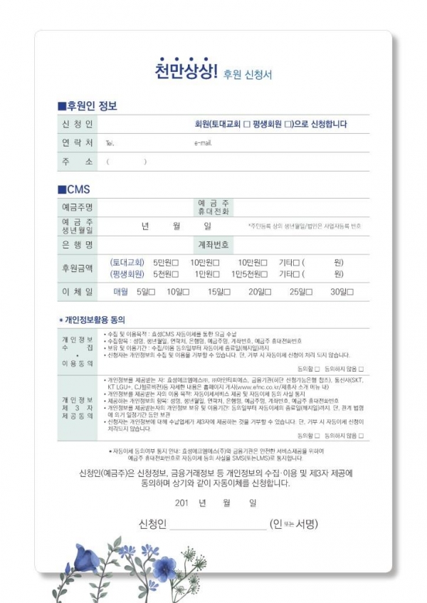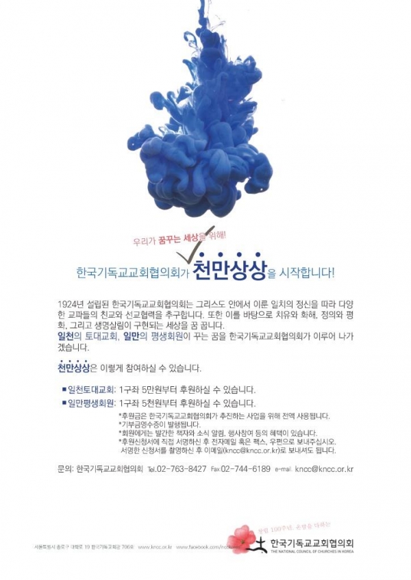 천만상상 후원자 명단 천만상상 후원금(53,520,000원) (1) 토대교회(45,750,000원) 강남교회(백용석), 강서교회(정헌교), 경주제일교회(정영택), 계동교회(황건원), 고기교회(안홍택), 고양감리교회(한광수), 고척교회(조재호), 대기리교회, 대덕교회(이중삼), 대봉교회(박희종), 동숭교회(서정오), 목민교회(김동엽), 본향교회(채영남), 부평제일교회(손호산), 상현교회(최기학), 서문장로교회(손달익), 서울세광교회(도준순), 서울숲교회(도준순), 세신교회(김종구), 수동교회(엄상현), 순복음도봉교회, 시온성교회(박정민), 여의도순복음교회(이영훈), 연신교회(이순창), 염산교회(김종익), 영강교회(서재일), 옥천제일교회(이 진), 전주화평교회(이영재), 전주효자동교회(백남운), 주안장로교회(주승중), 치유하는교회(김의식), 풍성한교회(조영성), 홍성교회(양정국) (2) 평생회원(7,770,000원) (주)에스에이솔루션, 갇피아, 강석훈, 권혁률, 권호경, 김경우, 김동현, 김성재, 김승동, 김영진, 김은하, 김종수, 김종옥, 김찬경, 김철모, 김철훈, 김태현, 김해성, 김현주, 김혜성, 김혜숙, 남관우, 동경채, 류태선, 박만서, 박민기, 박상증, 박종선, 박종소, 배태진, 변창배, 손승호, 안재웅, 안홍철, 양정완, 오창우, 유경재, 윤경로, 이경호, 이근복, 이문숙, 이미숙, 이미자, 이미진, 이미화, 이민지, 이범성, 이상진, 이승열, 이정권, 이정석, 이정호, 이주연, 이주영, 이중호, 이충재, 이홍정, 임광빈, 임재한, 장성덕, 장창일, 전성수, 정계숙, 정영태, 정주진, 정현범, 조진호, 조혜진, 차선각, 채혜원, 최병학, 한미미, 한용길, 한재승