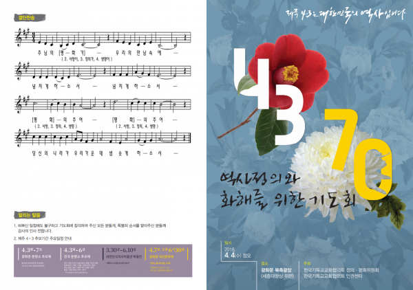 이제 한국교회는 집단살해로 인한 통곡과 냉전의 갈등을 대물림해온 지난 70년의 아픔을 끌어안고 참 평화와 상생의 길로 나아갈 것입니다. 제주 4․3사건이 우리 모두의 기억 속에 다시 평화의 꽃으로 피어나길 바라며 우리는 다음과 같이 기도하며 행동하겠습니다.