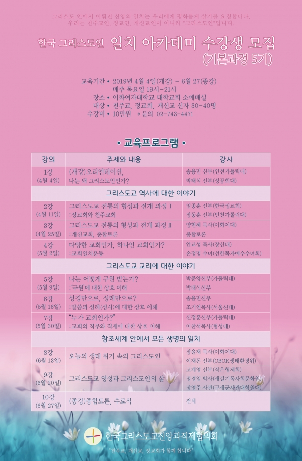 한국 그리스도교 신앙과 직제협의회 한국 그리스도인 일치아카데미 기본과정 5기 수강생 모집 일시: 4월 4일(개강)- 6월 27일(종강, 총 10강) 오후 7-9시 장소: 이화여자대학교 대학교회 소예배실 수강대상: 천주교, 정교회, 개신교 신자 외 수도자, 신학생 수강료: 10만원 *신청서 제출 팩 스 02-744-6189 이메일 revival2213@hanmail.net 신청서.hwp