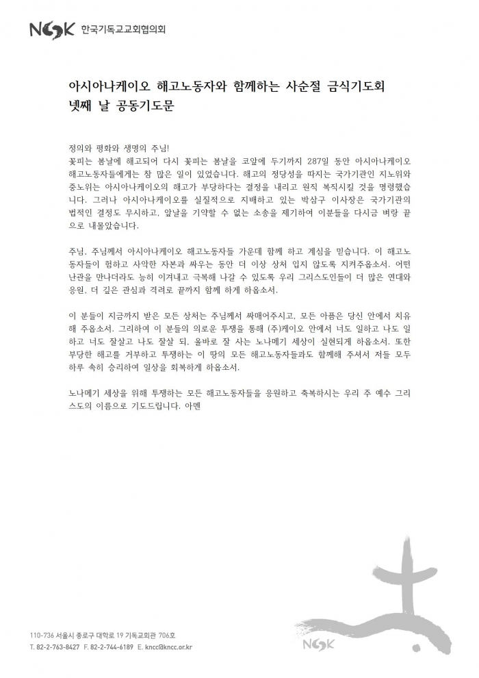 주님, 주님께서 아시아나케이오 해고노동자들 가운데 함께 하고 계심을 믿습니다. 이 해고노동자들이 험하고 사악한 자본과 싸우는 동안 더 이상 상처 입지 않도록 지켜주옵소서. 어떤 난관을 만나더라도 능히 이겨내고 극복해 나갈 수 있도록 우리 그리스도인들이 더 많은 연대와 응원, 더 깊은 관심과 격려로 끝까지 함께 하게 하옵소서.