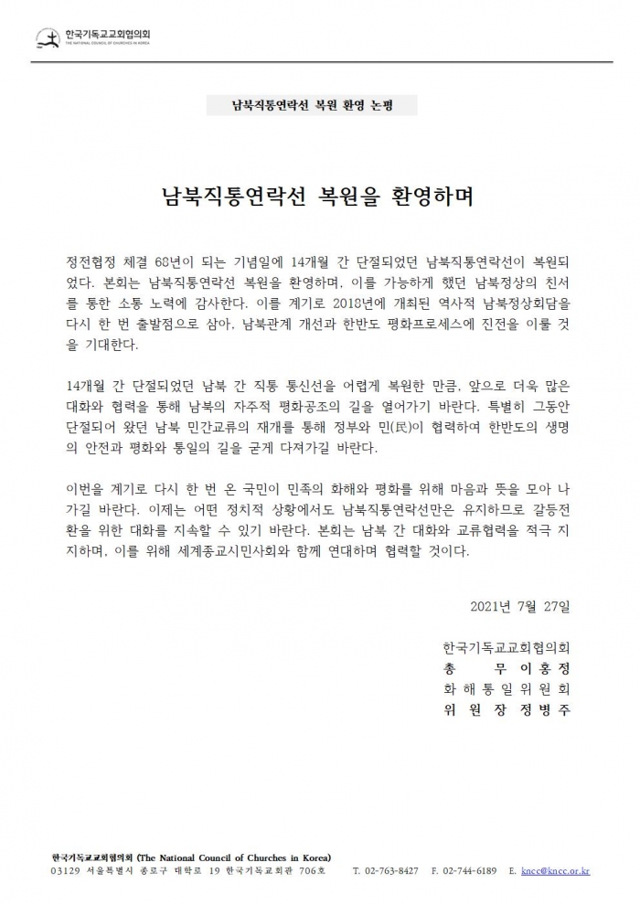 정전협정 체결 68년이 되는 기념일에 14개월 간 단절되었던 남북직통연락선이 복원되었다. 본회는 남북직통연락선 복원을 환영하며, 이를 가능하게 했던 남북정상의 친서를 통한 소통 노력에 감사한다. 이를 계기로 2018년에 개최된 역사적 남북정상회담을 다시 한 번 출발점으로 삼아, 남북관계 개선과 한반도 평화프로세스에 진전을 이룰 것을 기대한다.