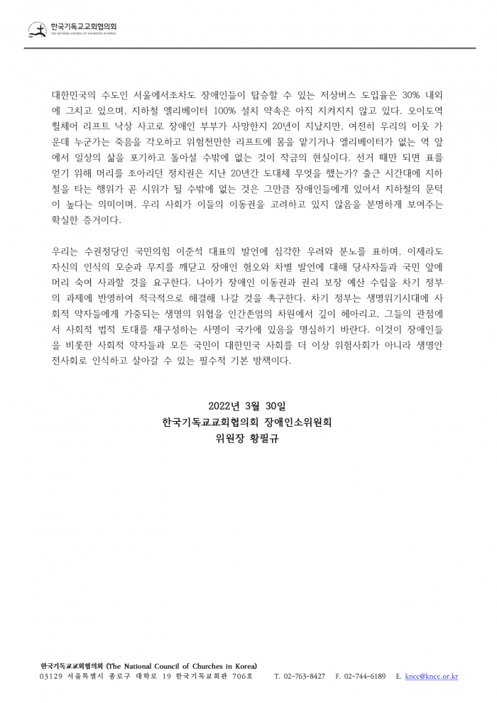 2. 한국기독교교회협의회(NCCK, 회장 장만희 사령관, 총무 이홍정 목사) 장애인소위원회(위원장 황필규 목사)는 이준석 국민의힘 대표의 장애인 혐오와 차별 발언에 관하여 성명서를 발표합니다.