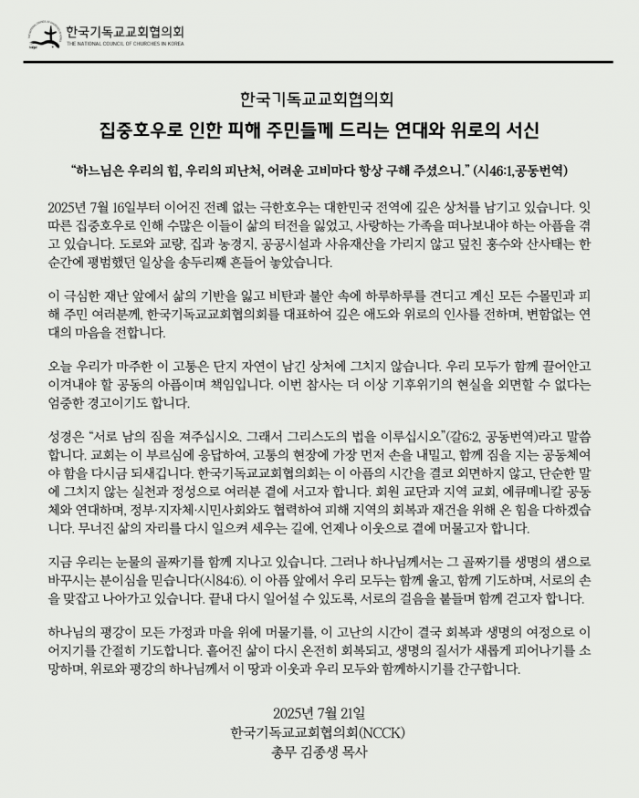 한국기독교교회협의회(NCCK, 김종생 총무)는 최근 전국적으로 발생한 집중호우로 인한 대규모 피해 상황에 깊은 우려를 표하며, 피해 주민들과의 연대를 천명하고자 『집중호우 피해 주민들께 드리는 연대와 위로의 서신』을 아래와 같이 작성·발표합니다.